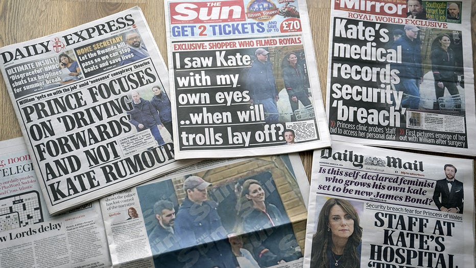 A view of the newspaper headlines that published photographs of Princess Kate during a casual outing with her husband, Prince William, at a farm produce market in Windsor on March 20, 2024 in London, United Kingdom. (Photo by Rasid Necati Aslim/Anado