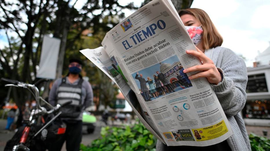 A woman reads a local newspaper which front page displays the news on the inauguration of US President Joe Biden, in Bogota on January on 21, 2021. (Photo by Juan BARRETO / AFP) (Photo by JUAN BARRETO/AFP via Getty Images)