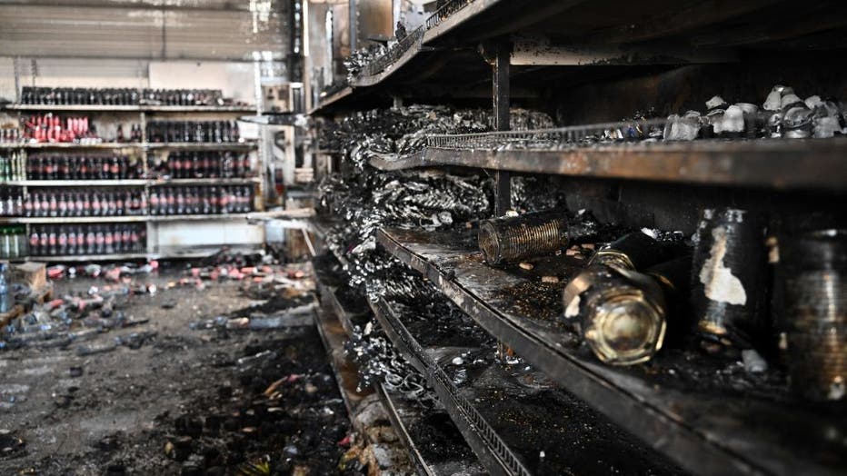 A photograph taken on June 28, 2022 shows charred goods in a grocery store of the destroyed Amstor mall in Kremenchuk, one day after it was hit by a Russian missile strike according to Ukrainian authorities. - A Russian missile strike on a crowded ma