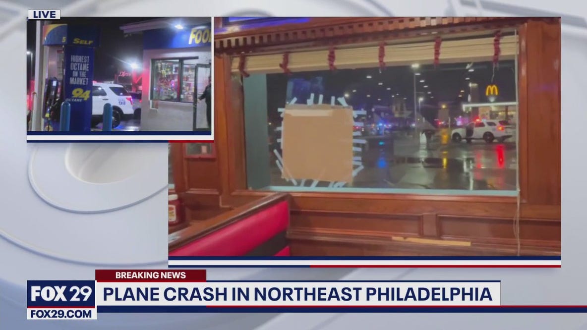 A plane crashed into a Philadelphia neighborhood sending debris into a diner, seriously injuring a patron who was hit in the head.