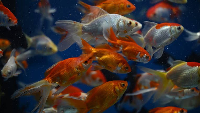 ANKARA, TURKIYE - APRIL 13: Goldfish (Carassius auratus) are seen at the aquarium as freshwater fish of different species offer a visual feast with their fin structures, interactions with light, camouflage strategies and colorful lives in Ankara, Tur