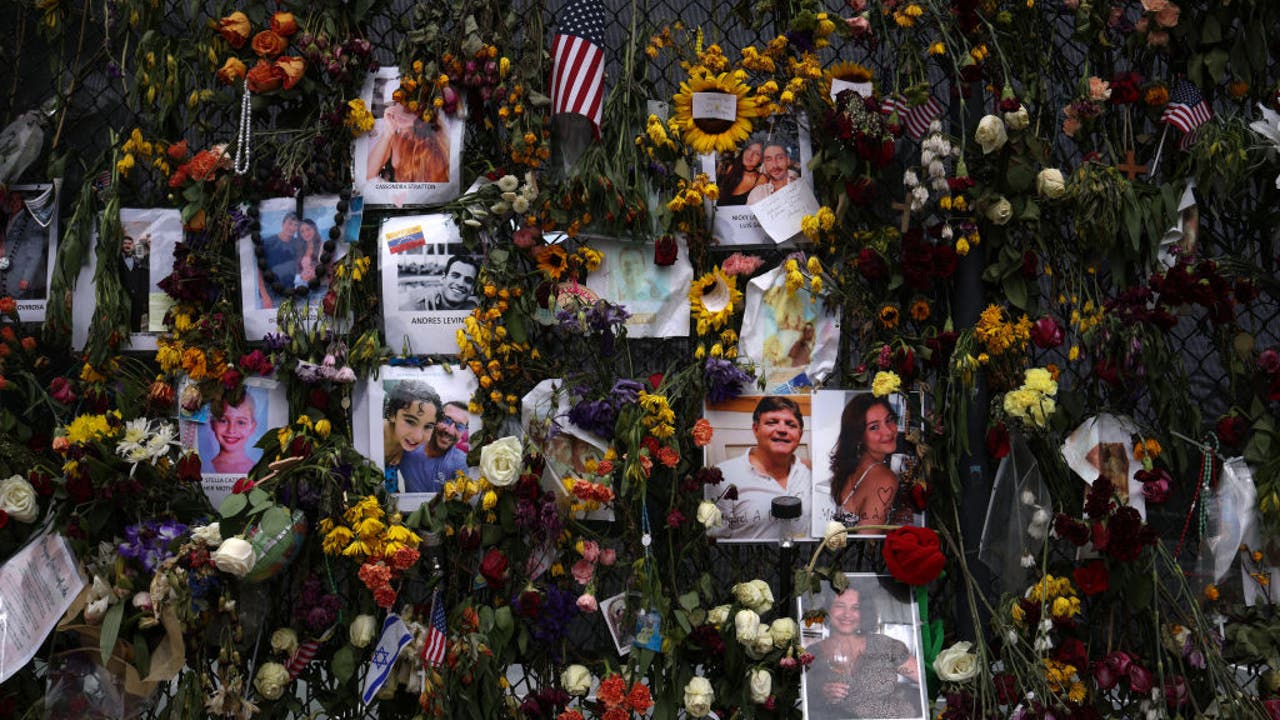 Signs and flowers hang on the memorial site of the collapsed 12-story Champlain Towers South condo building on July 10, 2021 in Surfside, Florida. (Photo by Anna Moneymaker/Getty Images)