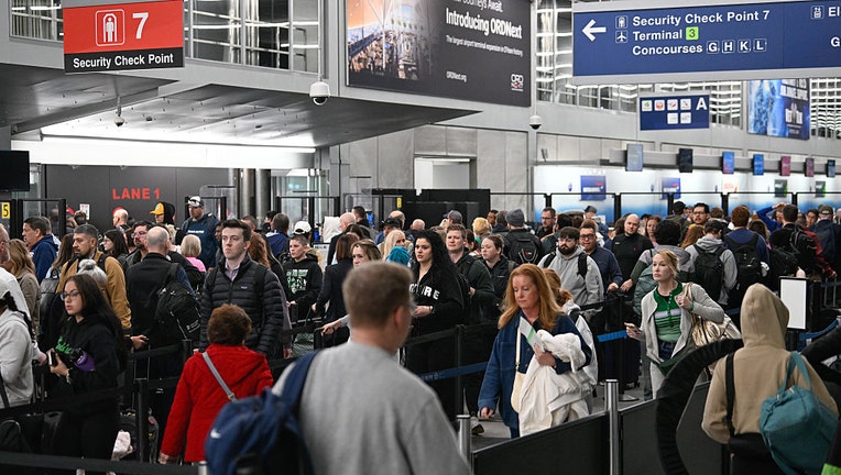 FILE-People wait in long TSA lines as the partial government shutdown continues for several weeks at airports like Chicago O'Hare International Airport in Chicago, IL, on March 09, 2026 (Photo by Peter Zay/Anadolu via Getty Images)