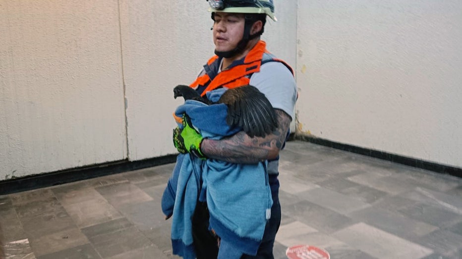 Rescuer holding captured chicken. (MetroCDMX via Storyful)