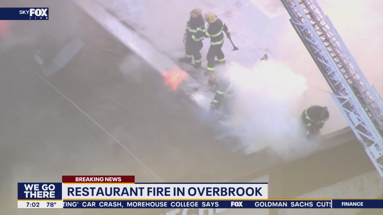PHILADELPHIA - Smoke and flames billow from a pizza shop in Philadelphia's Overbrook section Wednesday morning.