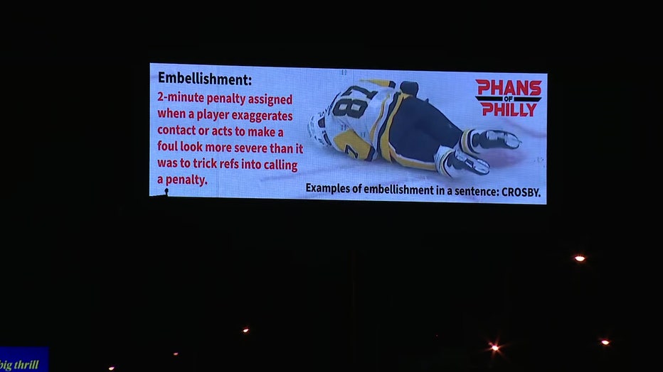 PHILADELPHIA - The Philadelphia Flyers are one win away from advancing over the Pittsburgh Penguins in the Stanley Cup Playoffs, but fans in Philly haven't forgotten about Sidney Crosby's embellishment penalty in Game 3.