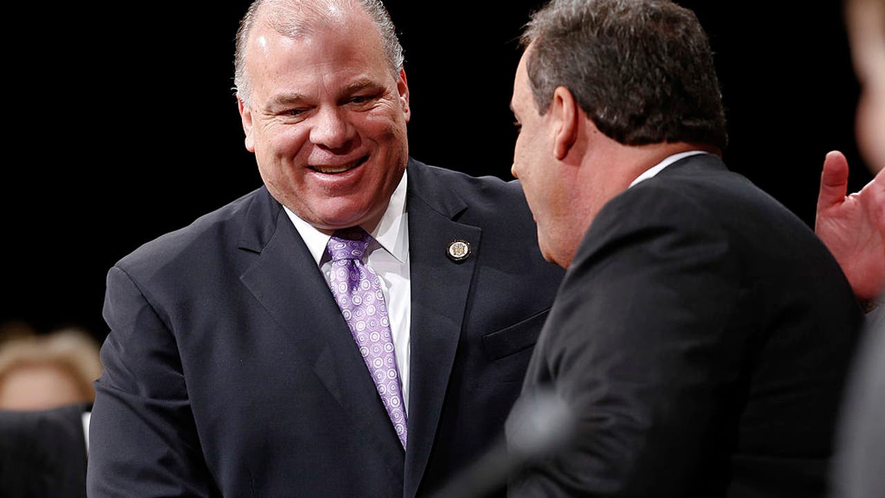TRENTON, NJ - JANUARY 21: New Jersey Senate President Steve Sweeney greets New Jersey Gov. Chris Christie prior to being sworn in for his second term on January 21, 2014 at the War Memorial in Trenton, New Jersey. Christie begins his second term amid