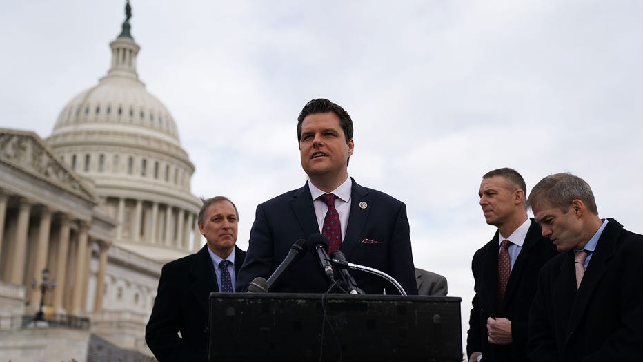 WASHINGTON, DC - DECEMBER 06: U.S. Rep. Matt Gaetz (R-FL) (2nd L) speaks as (L-R) Rep. Andy Biggs (R-AZ), Rep. Scott Perry (R-PA), and Rep. Jim Jordan (R-OH) listen during a news conference in front of the Capitol December 6, 2017 in Washington, DC.