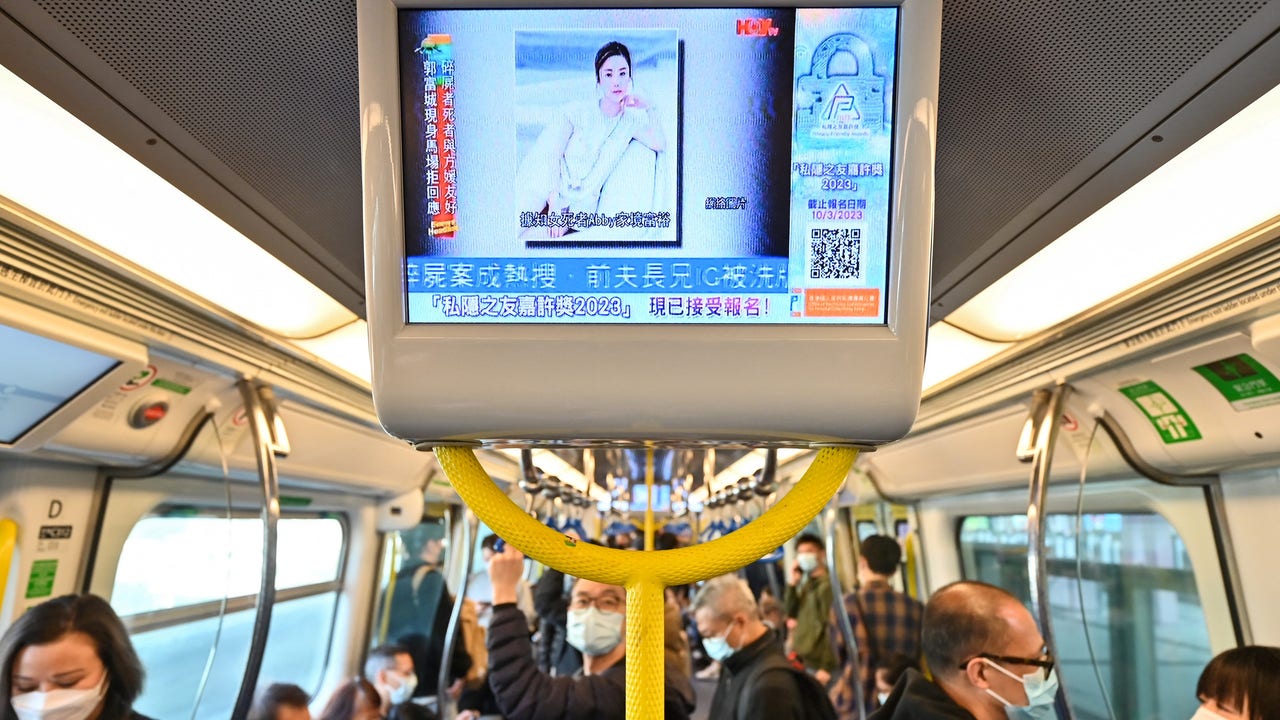 People watch a screen on a Hong Kong train showing news about model and influencer Abby Choi, whose partial remains were found by the police at a house. (Photo by PETER PARKS/AFP via Getty Images)
