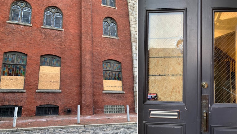 Several of the church's stained-glass windows could be seen boarded up by Monday afternoon.