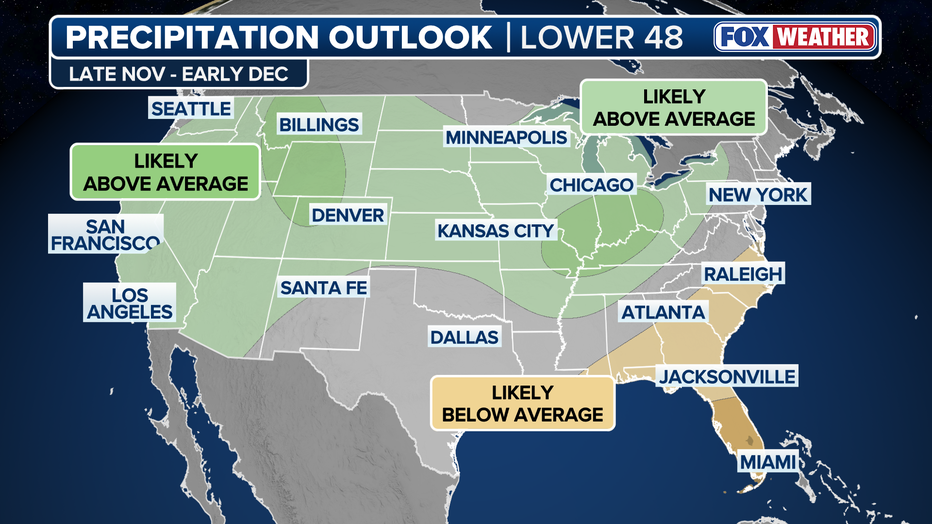 This graphic displays the precipitation outlook for the lower 48 for later November into December. (FOX Weather)