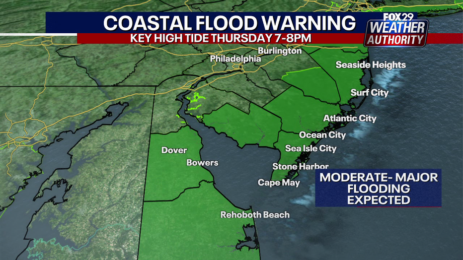 Pockets of showers are expected at the shore in New Jersey and Delaware with moderate to major flooding.