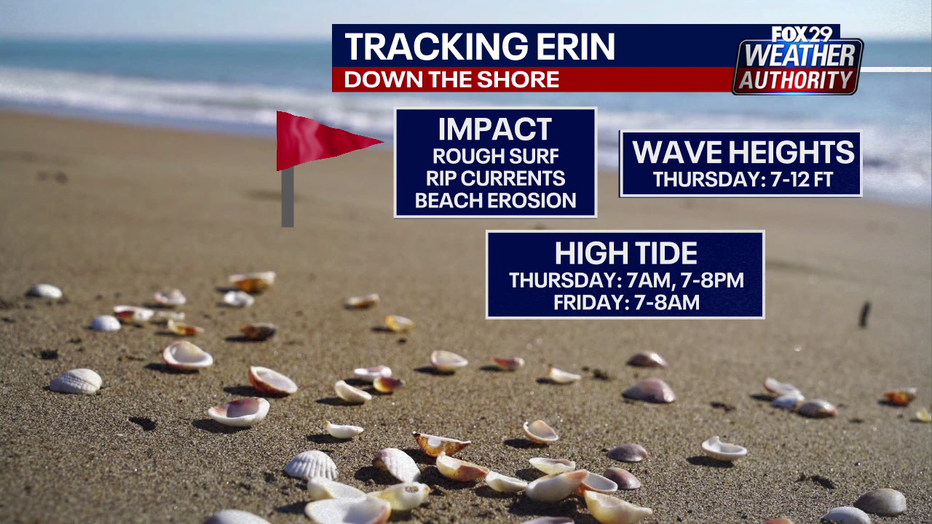 The highest impacts of Hurricane Erin are expected to hit the Jersey Shore and Delaware beaches during the afternoon and evening hours on Thursday.