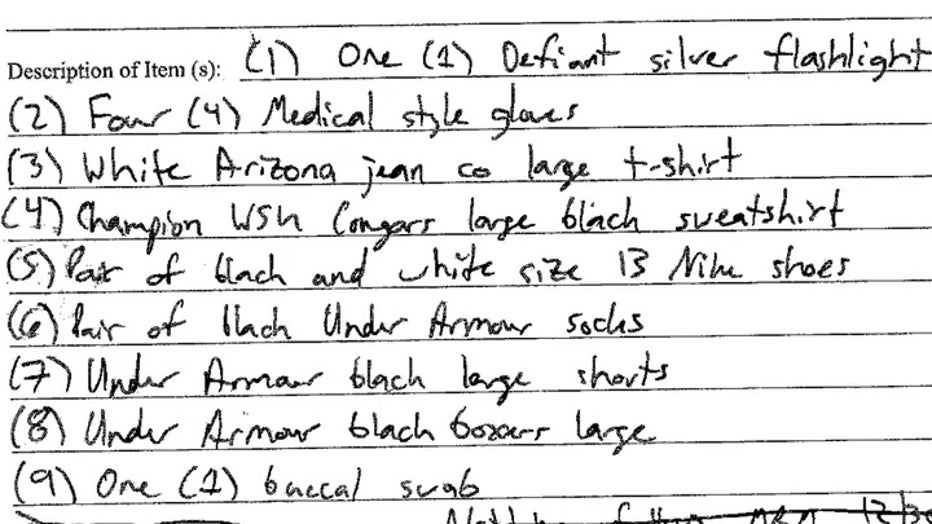 Police seized a number of new items at the home, including medical-style gloves, a black sweatshirt, size 13 Nike sneakers, and they also took a buccal scrub.