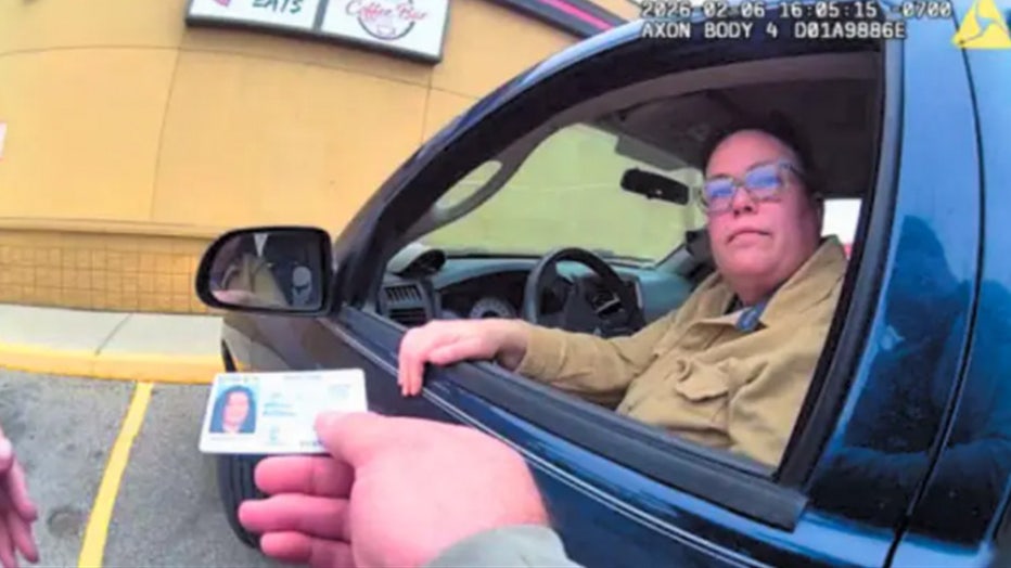 Sarah Elizabeth George during a Feb. 6, 2026, traffic stop while seated in a blue Dodge Dakota pickup truck. Investigators cited the vehicle in linking her to the alleged attack on a building housing Department of Homeland Security offices. (U.S. Dis