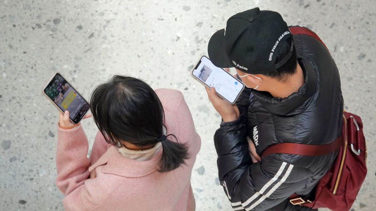 FILE - Two people use an iPhone at a shopping mall in Yantai, East China's Shandong province, on March 26, 2022. (Photo credit: Costfoto/Future Publishing via Getty Images)