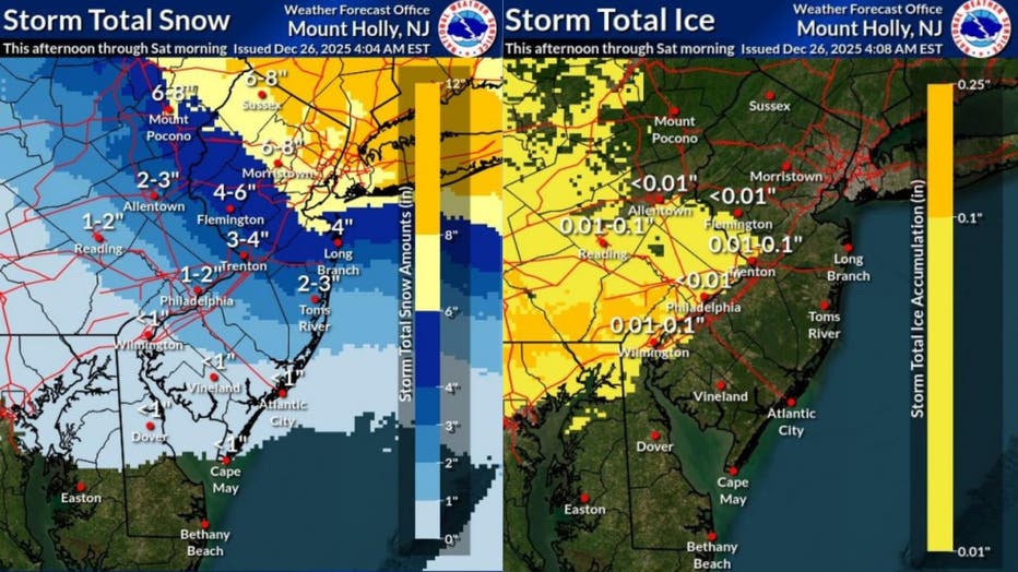 Along with the snow, the storm is expected to bring potential for ice across the region. Some areas may see precipitation shift from snow to freezing rain, according to the NWS. Accumulations of up to a tenth of an inch of ice are possible in parts of New Jersey.