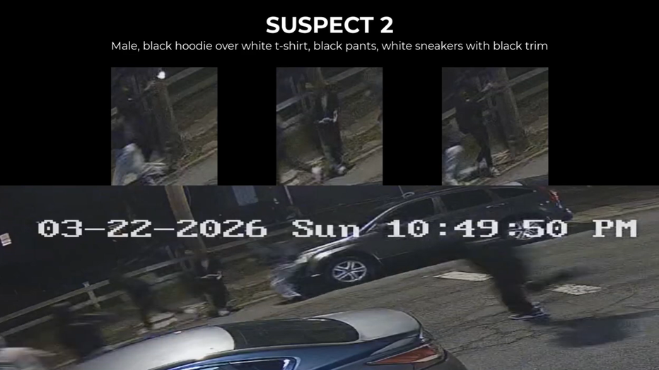 - Suspect #2: Male wearing a black hoodie over a white T-shirt, black pants, and white sneakers with black trim.
