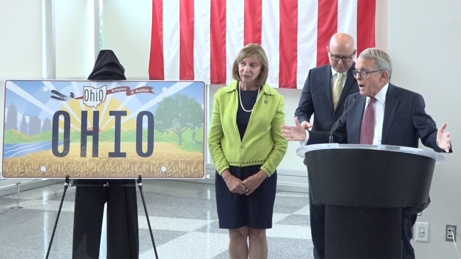 Ohio Gov. Mike DeWine (at lectern) helps unveil the state's new license plate, Oct. 21, 2021. (Via Governor's Office)