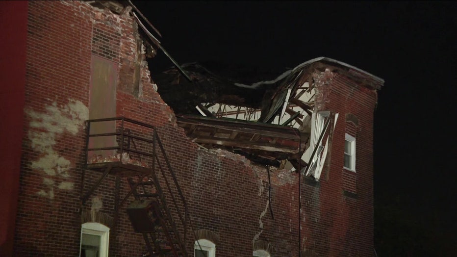 The partial collapse left a gaping hole in the side and roof of the two-story building.
