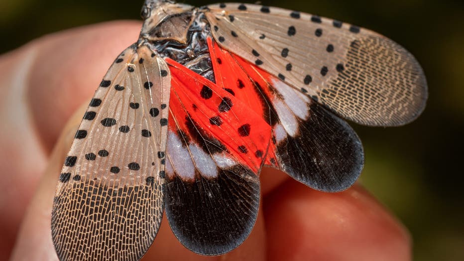 Vince Burkle, of the Indiana Department of Natural Resources, holds an adult spotted lanternfly found in Huntington, Indiana, on Aug. 17, 2022. (Andy Lavalley/Post-Tribune/Tribune News Service via Getty Images)