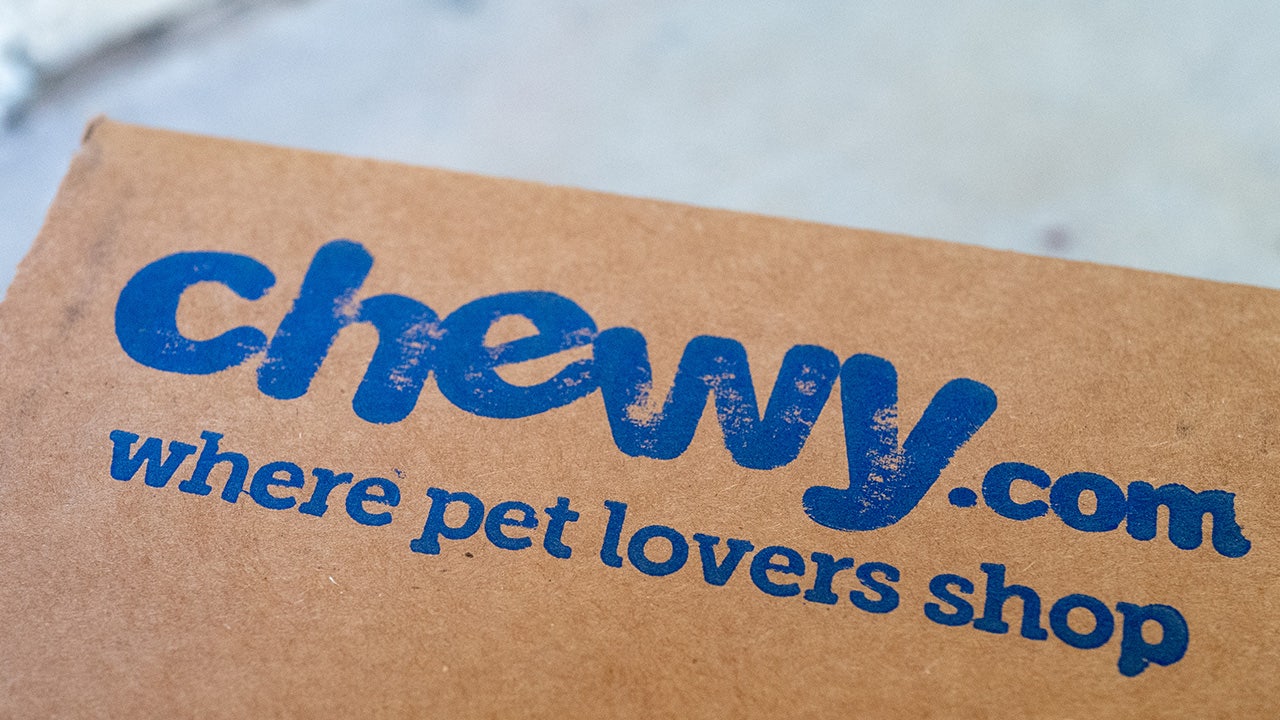 Close up of a "Chewy.com where pet lovers shop" logo on a box from pet-product online retailer Chewy. (Credit: Smith Collection/Gado/Getty Images)
