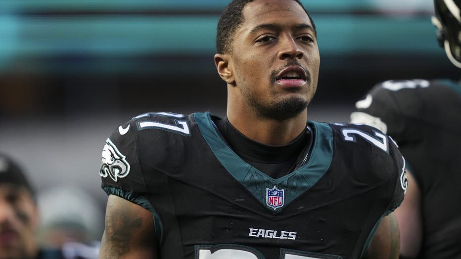 PHILADELPHIA, PENNSYLVANIA - NOVEMBER 28: Quinyon Mitchell #27 of the Philadelphia Eagles looks on from the sideline during an NFL football game against the Chicago Bears at Lincoln Financial Field on November 28, 2025 in Philadelphia, Pennsylvania.
