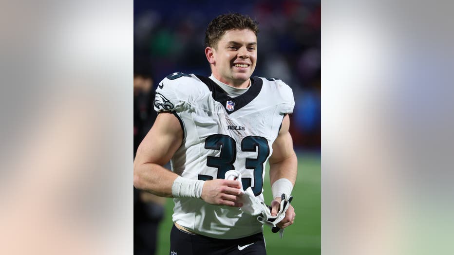 ORCHARD PARK, NEW YORK - DECEMBER 28: Cooper Dejean (33) of the Philadelphia Eagles after game against the Buffalo Bills at Highmark Stadium on December 28, 2025 in Orchard Park, New York. (Photo by Timothy T Ludwig/Getty Images)