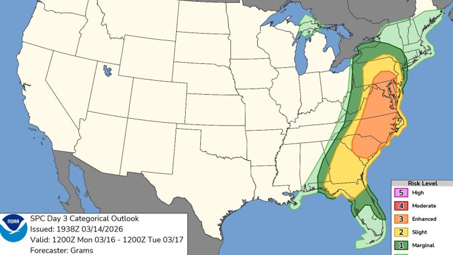 On Friday, the National Weather Service's Storm Prediction Center put much of the Mid-Atlantic region at an "enhanced risk" level for severe weather Monday. That warning zone extends from southern Pennsylvania in the north down to South Carolina.
