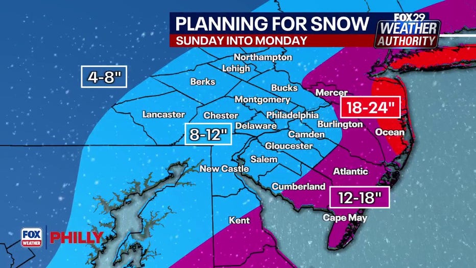 Overnight Sunday: This is when the heaviest snow will come, with totals between 6 and 12 inches in Philadelphia and the surrounding Pennsylvania Counties, parts of southern New Jersey and northern Delaware; 12 to 18 inches expected in southern Delaware and coastal New Jersey counties; and between 3 and 6 inches west of Berks and Lancaster counties.