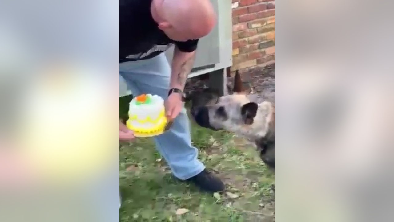This video shows Deputy Cronin, Vise’s handler, giving him a birthday cake and serenading him with a song.