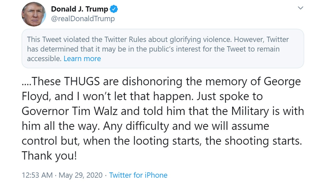 Twitter added a warning to Trump's tweet about the Minneapolis protests, saying it violated the platform’s rules about “glorifying violence.” Earlier this week, it applied fact checks to two of his tweets about mail-in ballots.