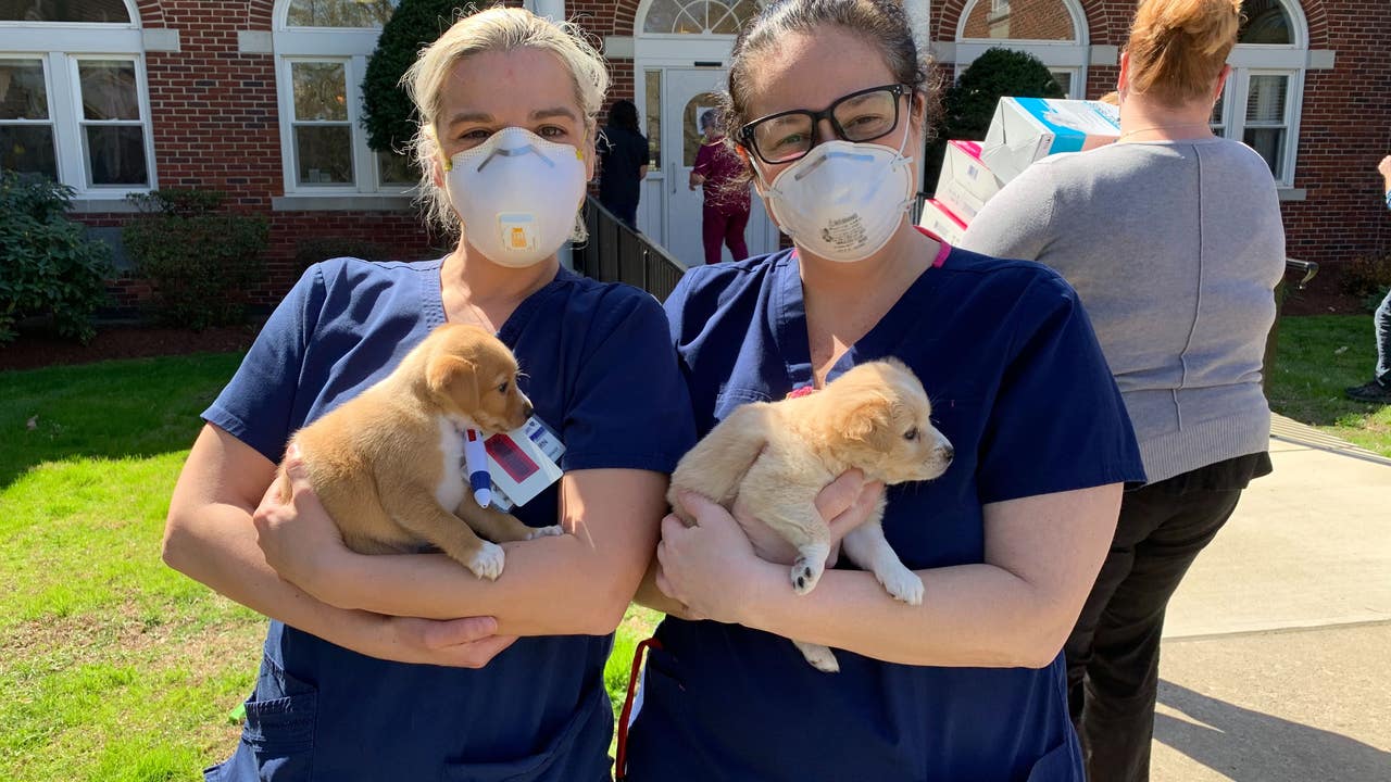 ManorCare nursing home residents were able to enjoy the cuteness of the Shrimp puppies through their windows. The puppies are the "spokesdogs" for the Providence Animal Center's #socialdistancing shirt campaign, which is a fundraiser to support their lifesaving operations during the COVID-19 shutdown.