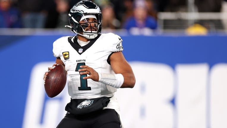 EAST RUTHERFORD, NEW JERSEY - OCTOBER 09: Jalen Hurts #1 of the Philadelphia Eagles looks to pass during the fourth quarter of the game against the New York Giants at MetLife Stadium on October 09, 2025 in East Rutherford, New Jersey. (Photo by Al Be