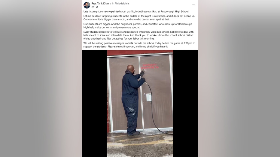 Roxborough High School was defaced with racist graffiti, including swastikas, on Saturday night, according to state Rep. Tarik Khan, who posted about the incident on social media Sunday afternoon. FOX 29's Kelly Rule has the story.