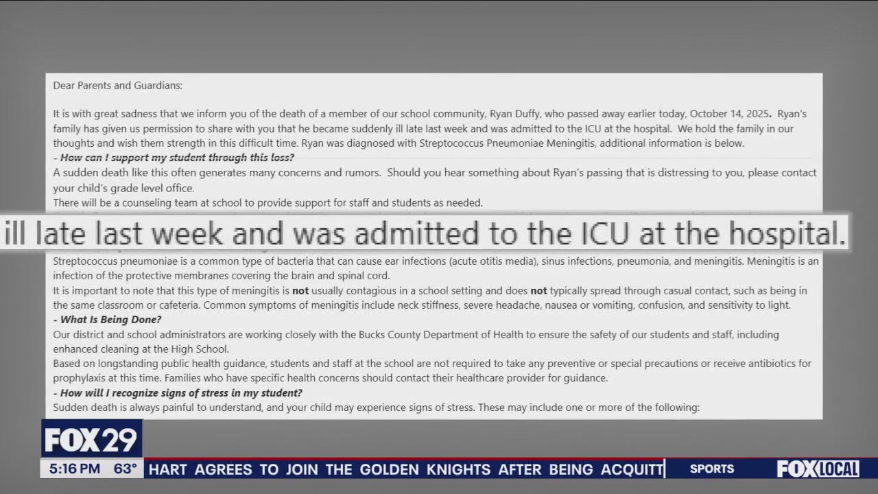 LANGHORNE, Pa. - A Bucks County community is mourning the loss of a Neshaminy High School student who passed away after contracting a strain of bacterial meningitis.