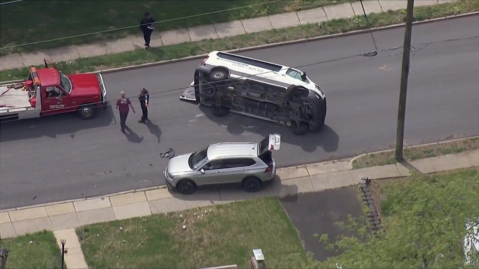 CHELTENHAM, Pa. - A school transport van overturned after crashing into a parked car on the 600 block of Chelten Hills Drive around 2:30 p.m. Friday, according to Cheltenham Township Police. No children were on the van and only minor injuries were reported.