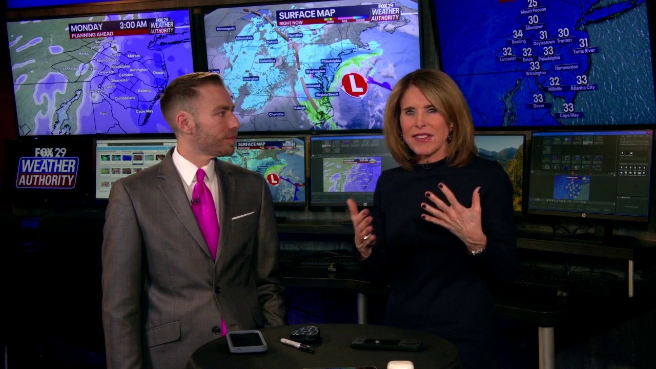 FOX 29 Meteorologists Kathy Orr and Drew Anderson give the latest update on Sunday night's snow storm.