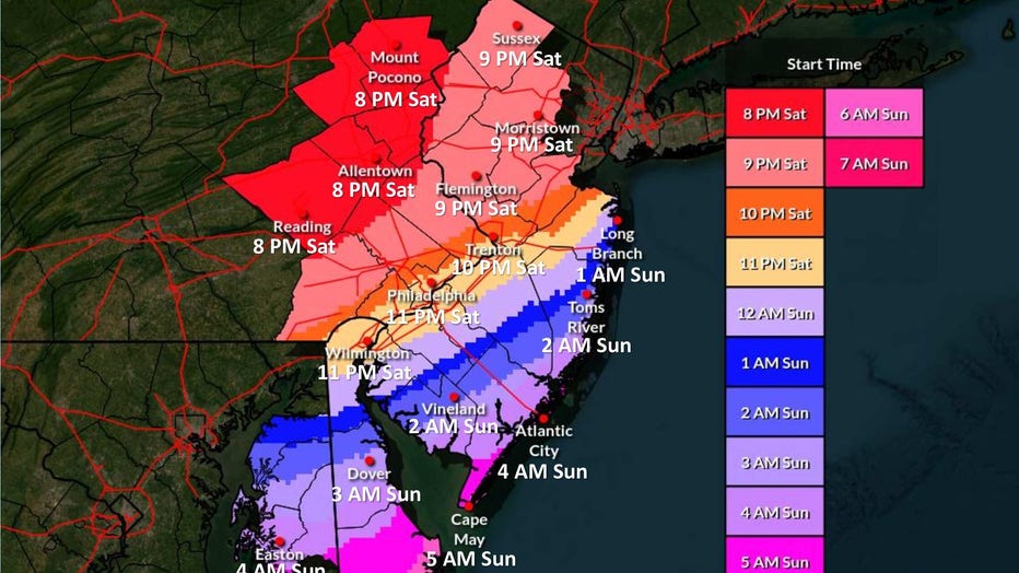- Philadelphia: Snow starts at roughly 11 p.m.