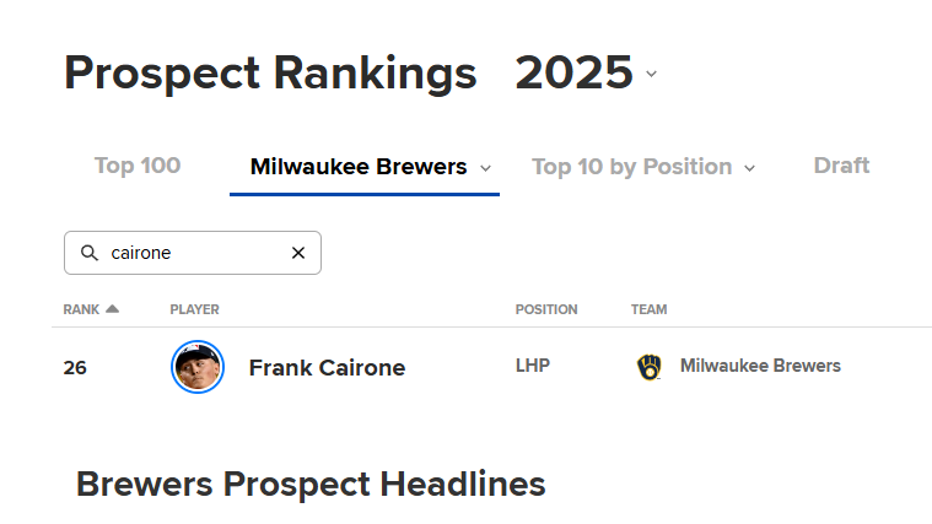 Frank Cairone ranked 26 for Prospect Rankings of Milwaukee Brewers in 2025. (https://www.mlb.com/milb/prospects/brewers/)