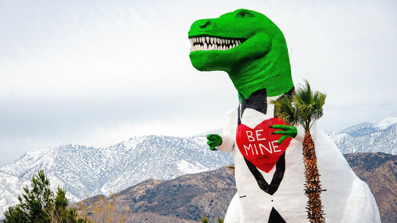 FILE - Mr. Rex, one of the two famous Cabazon Dinosaurs, wears a tuxedo as part of a transformation for Valentines Day in Cabazon on Wednesday, Jan. 27, 2021. (Watchara Phomicinda/MediaNews Group/The Press-Enterprise via Getty Images)