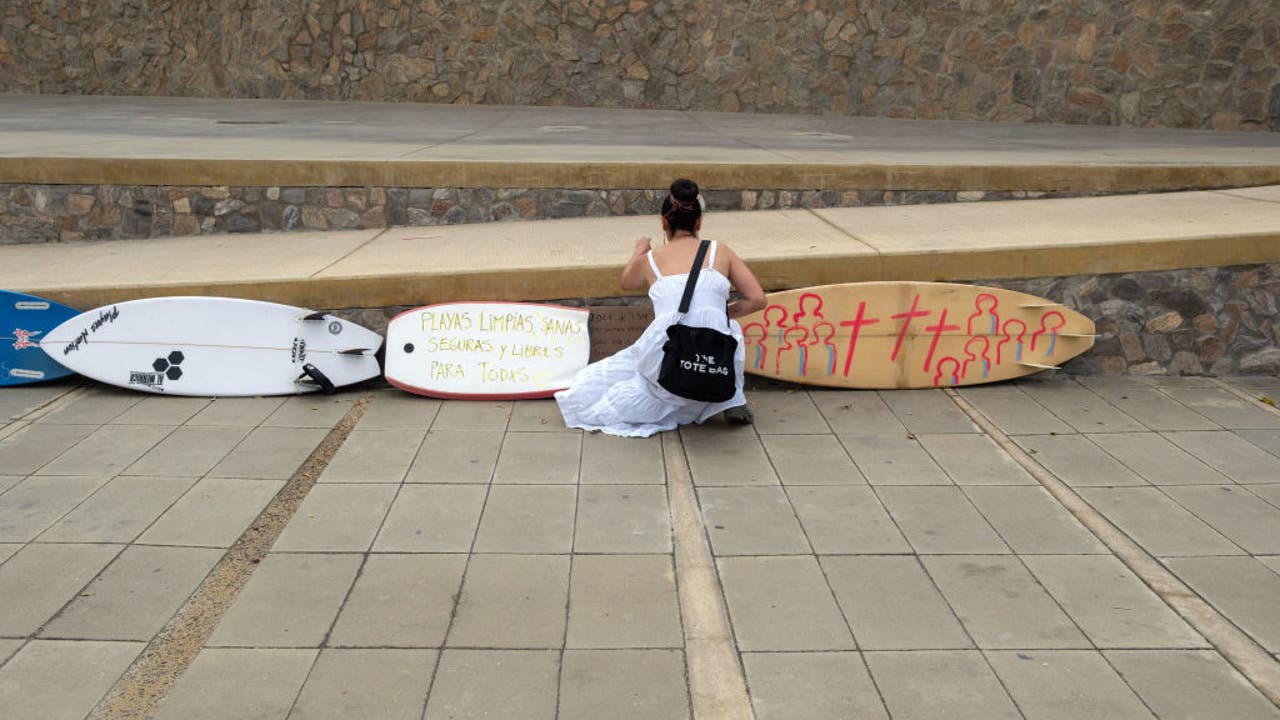 A woman participates in a protest with members of the surfing community against insecurity after two Australians and an American surfers went missing last week during a surfing trip, in Ensenada, Baja California state, Mexico, on May 5, 2024. Three b