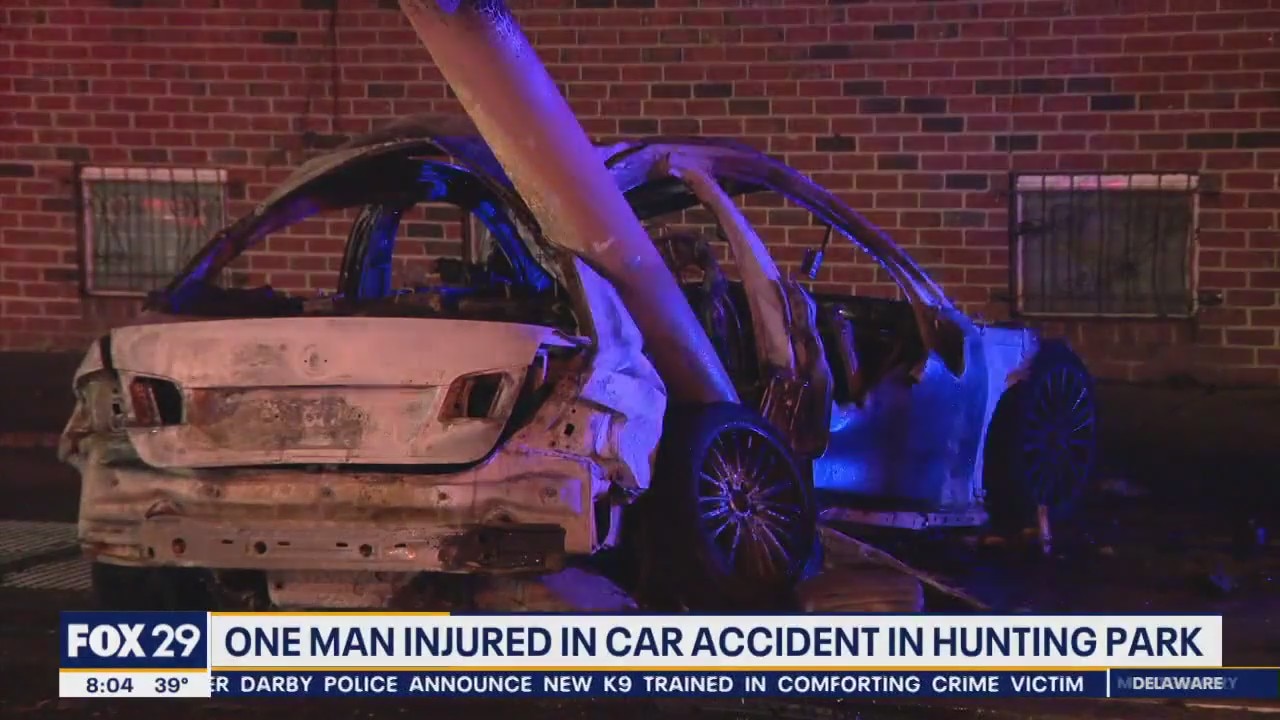 Two-car crash, vehicle fire leaves one man injured in Hunting Park, officials say