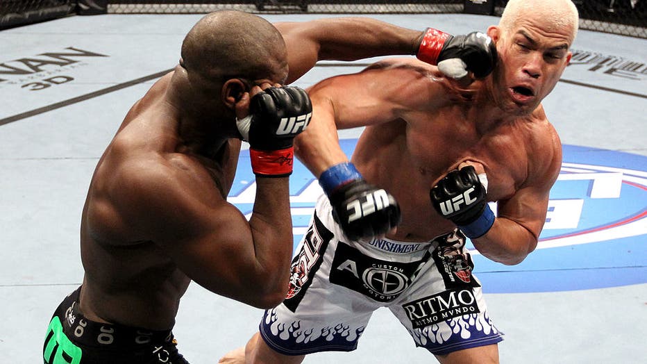 Rashad Evans punches Tito Ortiz during a light heavyweight bout at UFC 133 at Wells Fargo Center on August 6, 2011 in Philadelphia, Pennsylvania. (Photo by Al Bello/Zuffa LLC/Zuffa LLC via Getty Images)