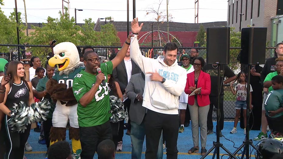 City leaders, the Philadelphia Eagles and Make the World Better Foundation celebrate the new turf field at Vare Recreation Center which is part of a $21 million transformation through the city's Rebuild program.