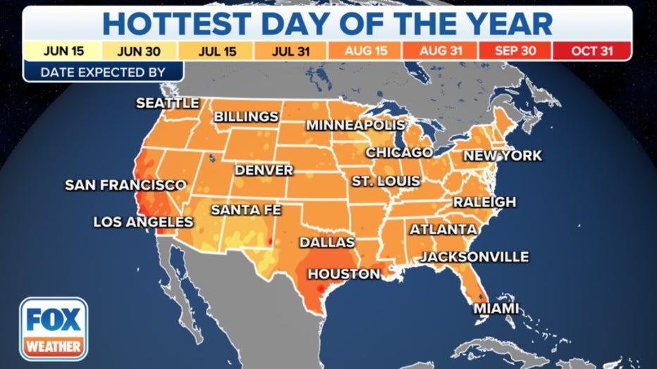 This map shows when the hottest day of the year is expected to occur based on the 1991-2020 climatological averages from NOAA's National Centers for Environmental Information. (FOX Weather)