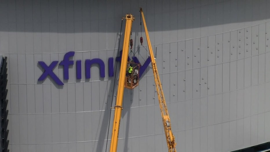 Signage displaying the building's fifth name change was installed using two cranes and a bucket truck on Thursday. SkyFOX captured the last letters of the purple Xfinity logo being set in place.