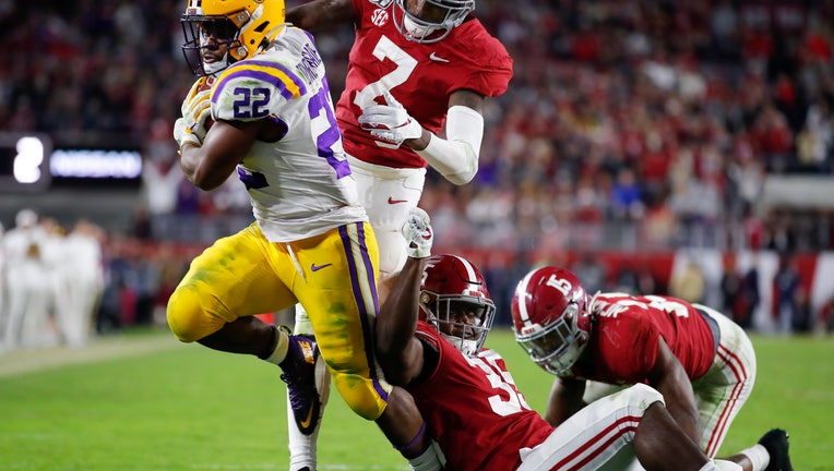 TUSCALOOSA, AL - NOVEMBER 09: Clyde Edwards-Helaire #22 of the LSU Tigers breaks tackles of Shane Lee #35 and Trevon Diggs #7 of the Alabama Crimson Tide to score a touchdown during the second half against the LSU Tigers at Bryant-Denny Stadium on No