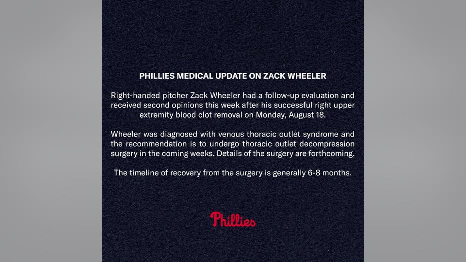 PHILADELPHIA, Pa. - Philadelphia Phillies right-handed pitcher Zack Wheeler has been diagnosed with venous thoracic outlet syndrome and will undergo surgery in the coming weeks, the team announced Saturday.