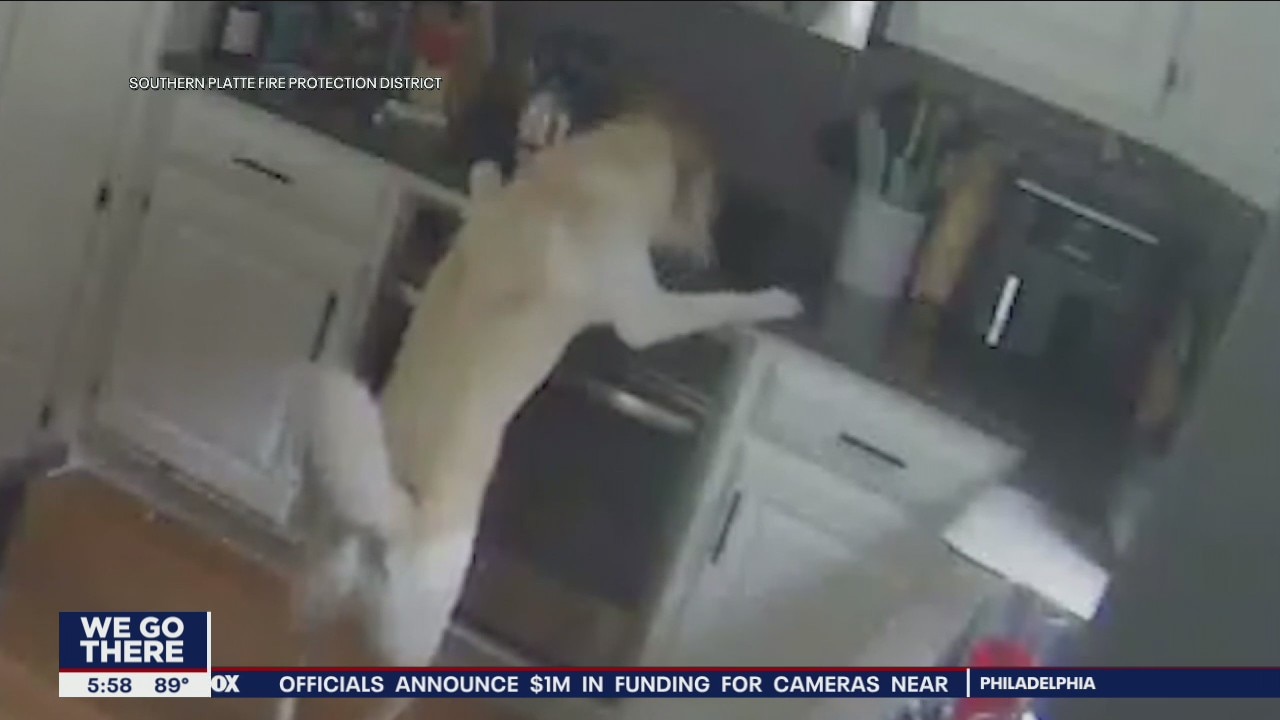 A family dog ignited a devastating grease fire when it jumped onto the kitchen stove to smell a pan. The far too curious pup was rescued from the home along with another dog.